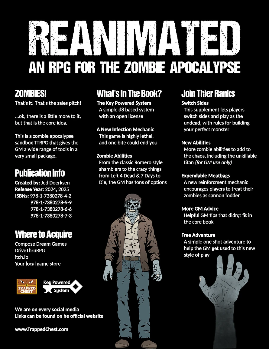 Doerksen’s company Trapped Chest is best known for Reanimated, a zombie apocalypse sandbox TTRPG and The Nullam Project, a rules-light orbital colony game. Both projects use the Key Powered System, a d8 based set of mechanics that Doerksen designed and released an SRD for so other designers can also use it in their games.