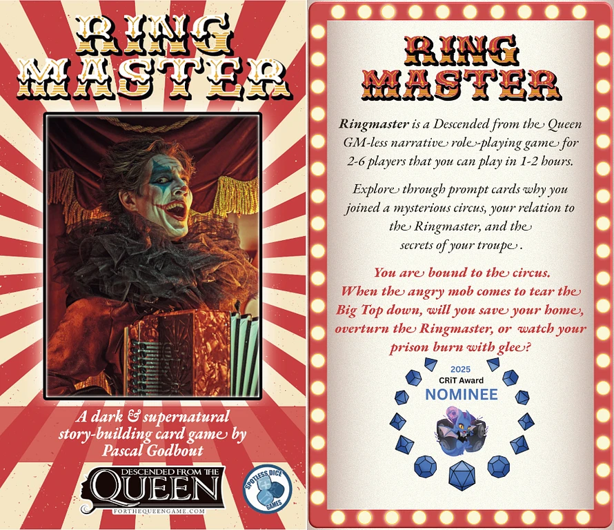 His journey into creation started in a wonderfully organic way. Pascal kept running Fate scenarios at cons, and players would come up after the game asking where they could buy them. That push of enthusiasm nudged him to reach out to Evil Hat, which led to the publication of two third-party Fate of Cthulhu PDF supplements. Those sales helped him take the next big leap: funding RINGMASTER, his first physical game, which uses the Descended from the Queen framework.